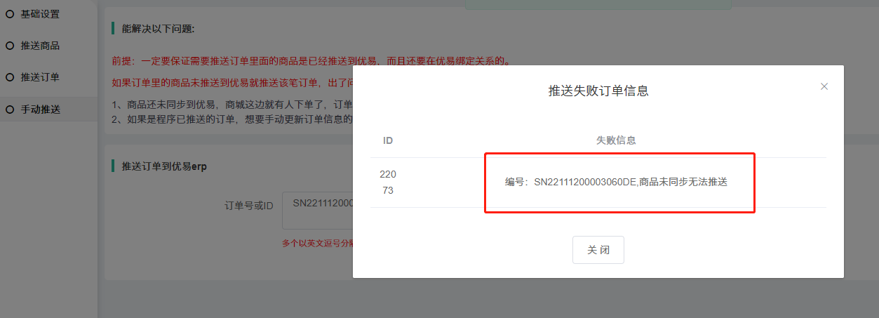 手动推送订单,提示:商品未同步无法推送