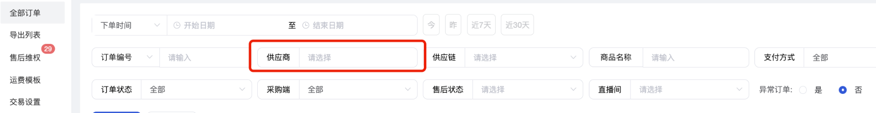(2)供应商:支持筛选平台自营、全部供应商、指定供应商订单;