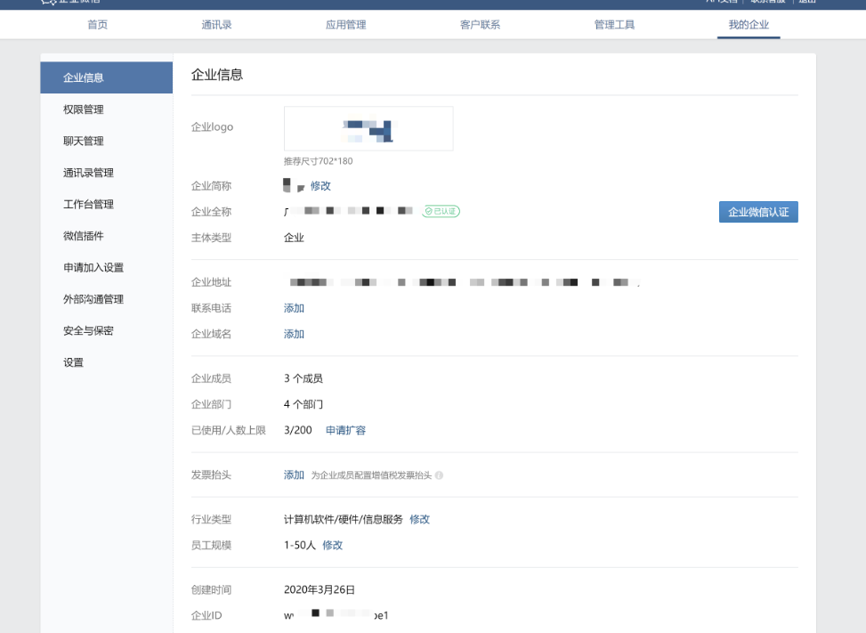- 设置:查看当前企业具体信息、配置企业微信信息;