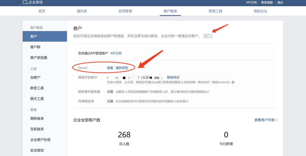 企业微信官方后台--客户联系--客户--API--secret中查看获取secret信息并填入企业管理PC端--设置--企业微信,客户管理secret中;