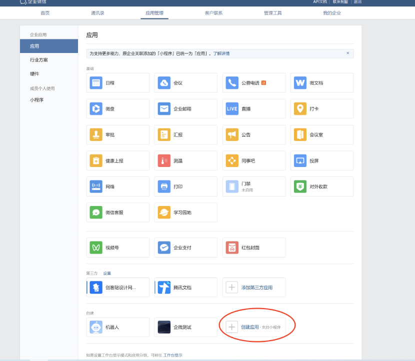 - 应用中心:显示当前企业具备的所有应用,并进行管理操作。