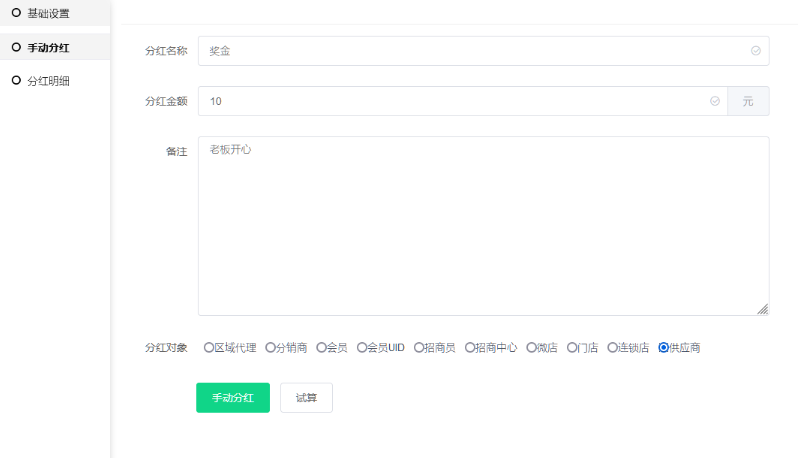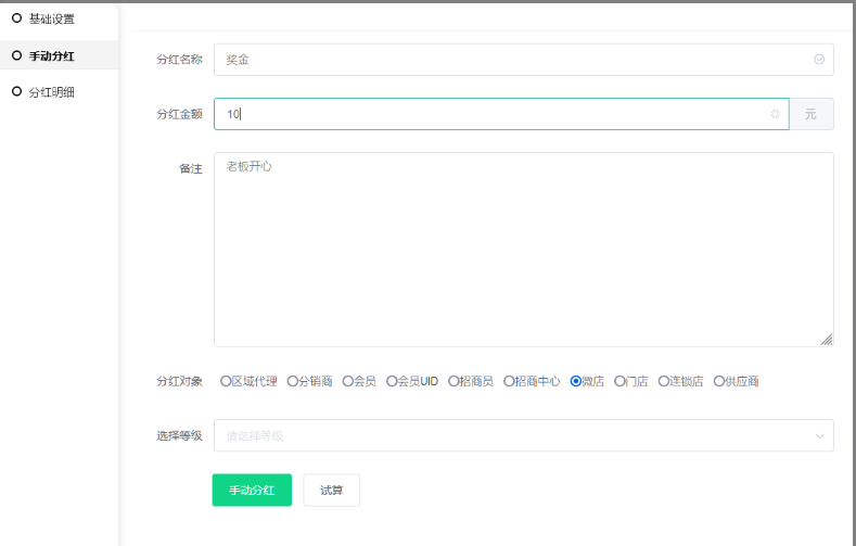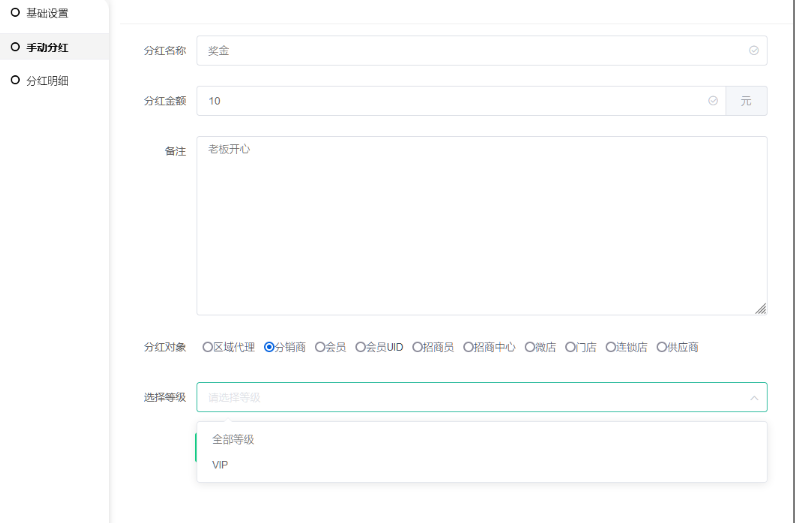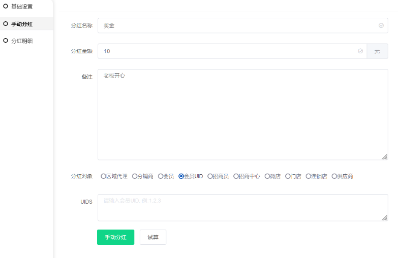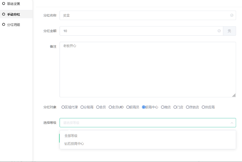 功能概述:给特定会员手动分红。注:给特定会员发放分红时需谨慎,请勿重复操作,发放分红若有延迟,刷新页面等大概2-5分钟观察即可。