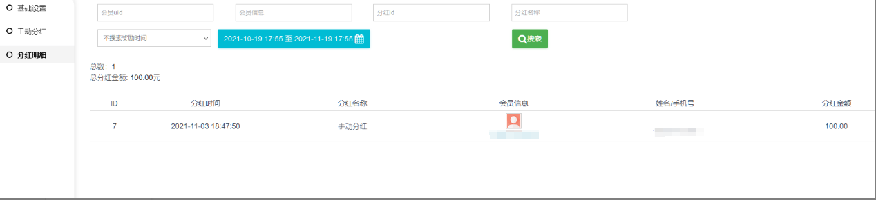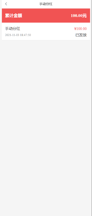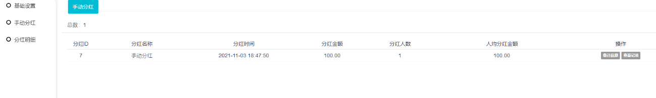 3、手动分红发放成功了,分红明细支持查看所有手动分红明细,查看每一次分红具体明细分红金额。