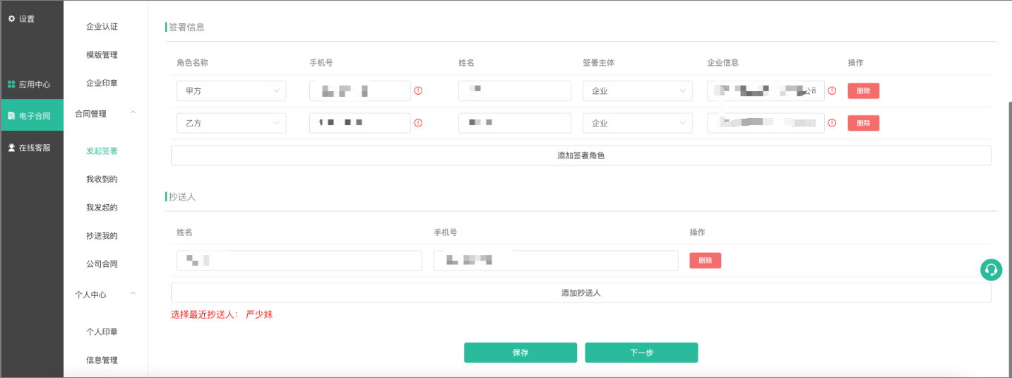 签署方信息都添加完成后,可选择性添加抄送人,然后进入下一步;