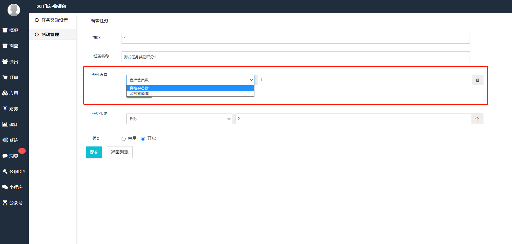 3、创建奖励任务,条件有两种,直推会员满和余额充值满。奖励有三种方式:积分,优惠券,爱心值。注意:创建好奖励任务后记得状态修改为开启