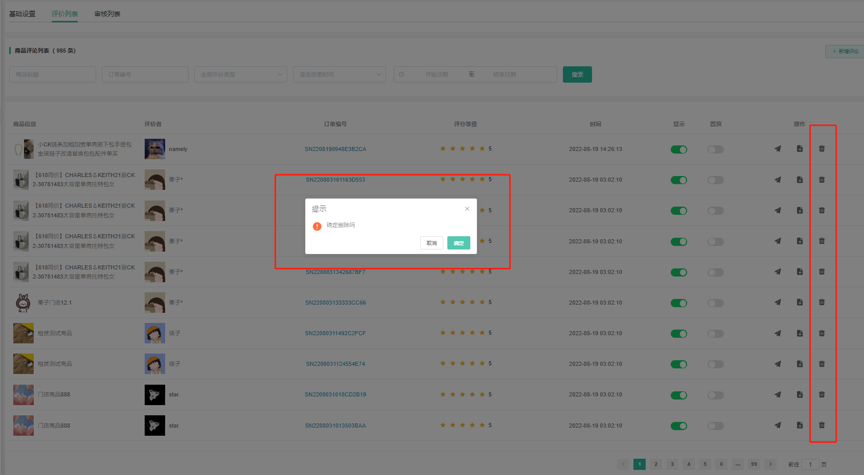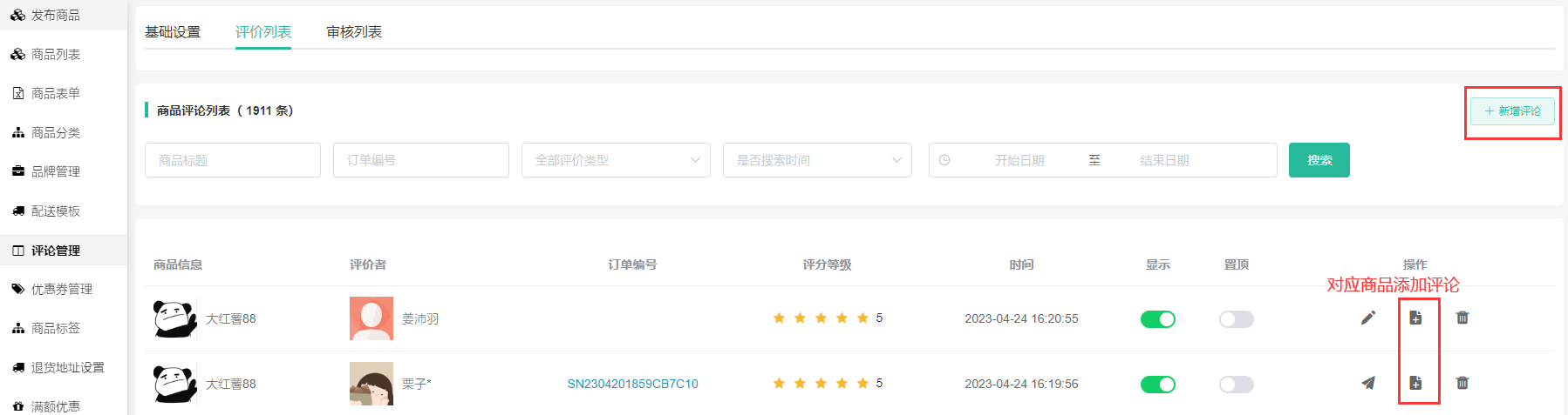 支持查看会员商品评价、是否通过审核、是否显示、是否置顶。