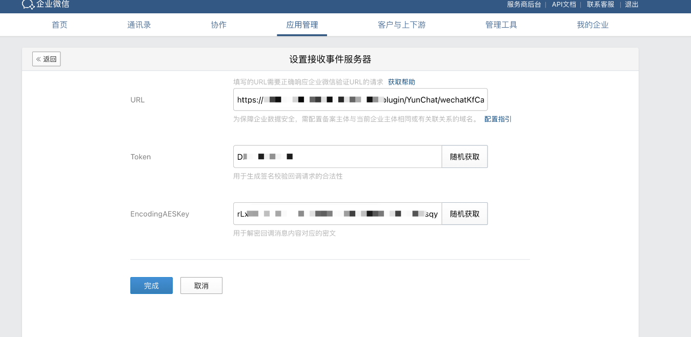 同时,在接收事件服务器中设置URL(企业微信客服服务器URL),随机获取Token、EncodingAESKey填入企业微信客服设置对应项目。