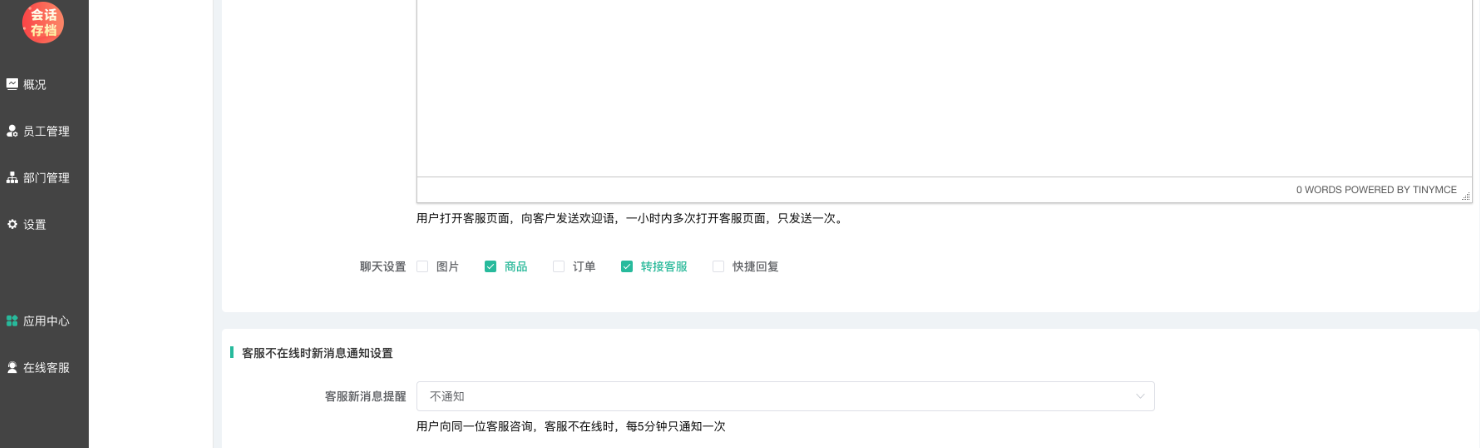支持编辑器图文设置,设置后,用户在前端发起客服咨询,自动回复欢迎语。