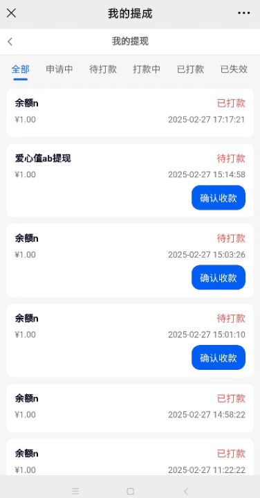 收入、余额提现,后台审核后,前端推广中心--收入--右上角提现记录--显示确认收款按钮(仅公众号、小程序,云打包APP显示,聚合APP没有)